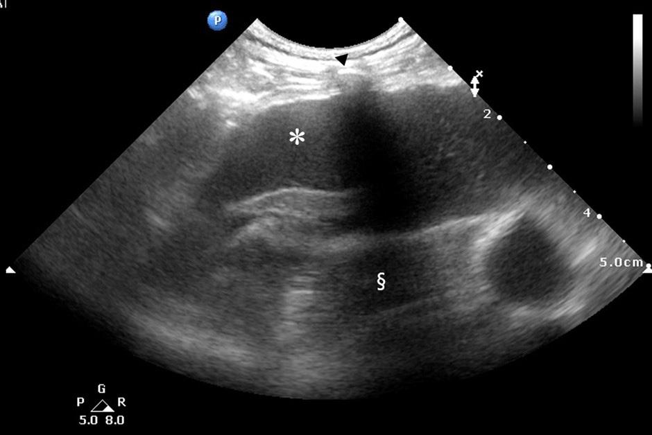 Hypoechoic pleural fluid (*) is observed in the thoracic cavity, and an echogenic shadow (§) is observed due to the impermeability of ultrasound to the ribs (arrow head).)