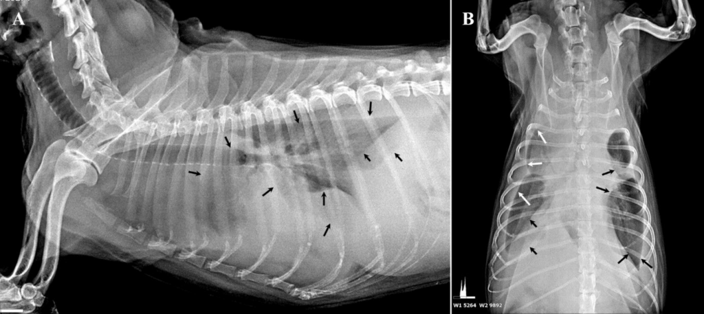 폐엽 사이 간극(검은색 및 흰색 화살표)에서 방사선 투과도의 차이가 관찰되었으며, 이는 흉수를 시사하는 소견입니다. (A) 우측 측면 영상 / (B) 복배(DV) 영상