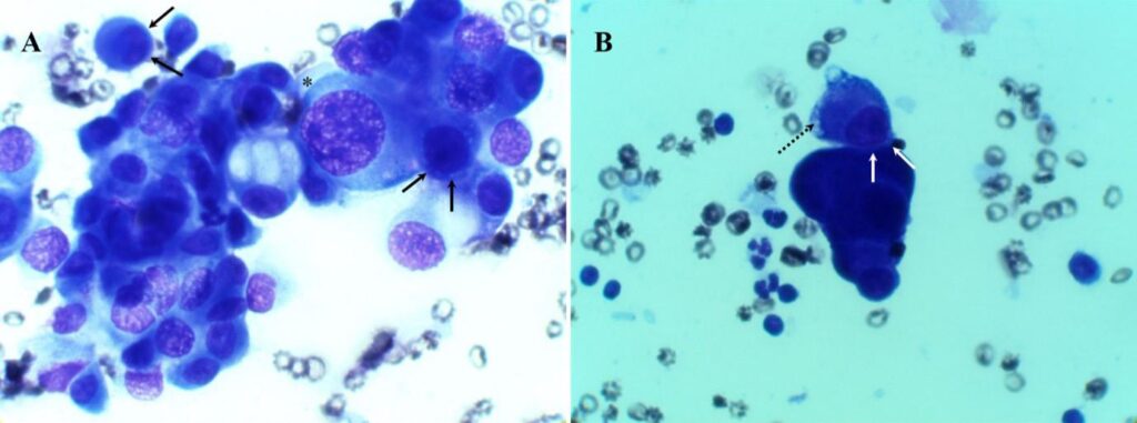 세포학적 검사에서는 중피세포의 비정상적 증식, 핵 비대, 다형성, 높은 핵/세포질 비율 등의 소견이 관찰될 수 있습니다.