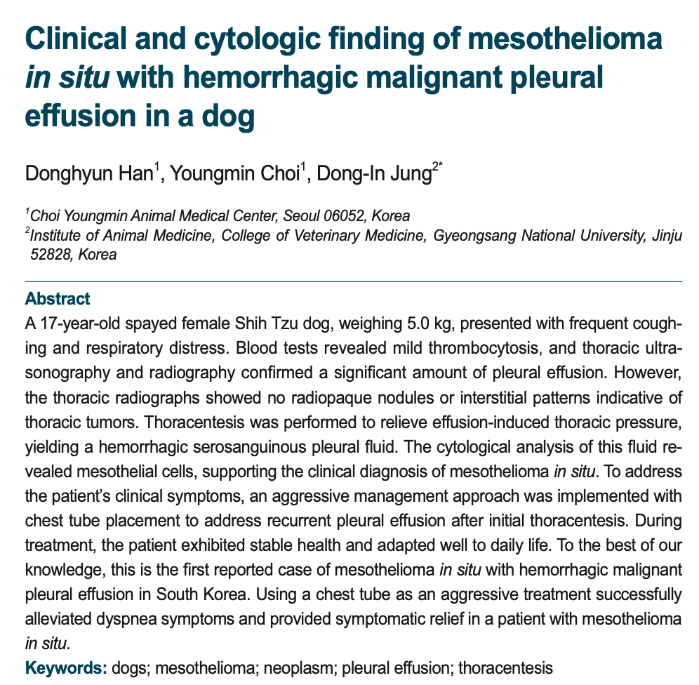 • 중피종은 반려견에서는 매우 드문 질환으로, 뚜렷한 종양 덩어리가 보이지 않으면서 흉수가 반복적으로 차오르는 형태로 나타나는 경우가 있습니다.
